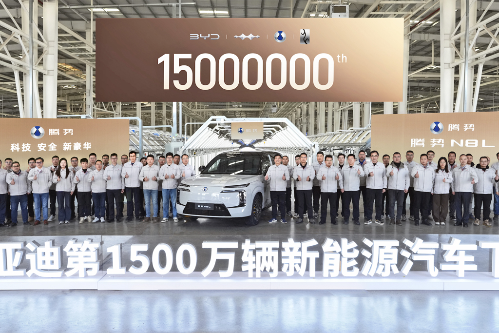 Pour souligner l’événement, des employés de l’usine se sont réunis pour la prise de la traditionnelle photo. Le véhicule qu’ils entouraient était non seulement le 15 millionième VÉB sorti des chaînes de production BYD, mais aussi le 15 000e exemplaire de l’utilitaire hybride branchable de luxe N8L produit jusqu’ici.