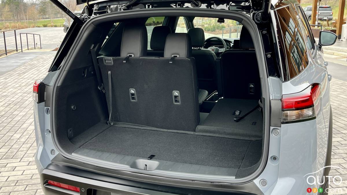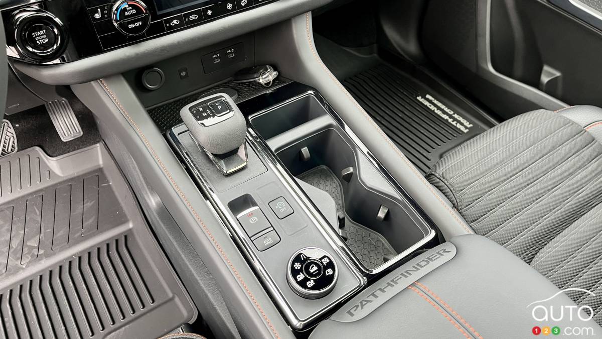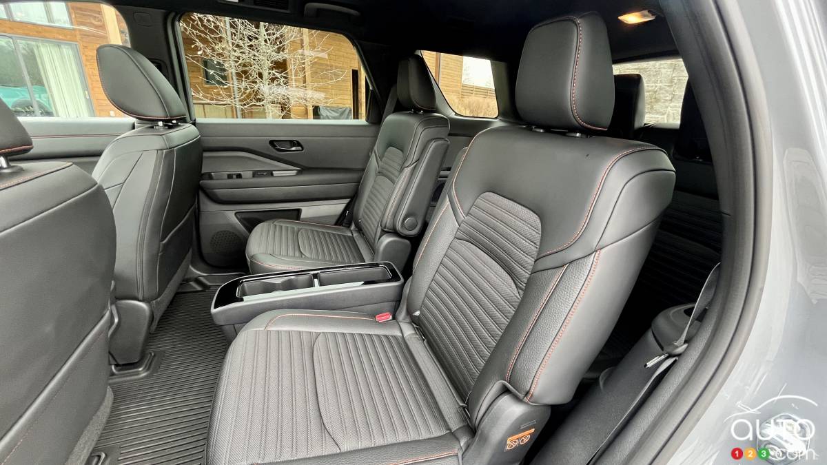 De série, le Pathfinder est proposé avec une configuration permettant d’accueillir huit occupants grâce à une banquette à trois places à la deuxième rangée. Comme dans le cas de bien des VUS dans ce segment, l’accès à la troisième rangée n’est pas optimal et le confort y est minimaliste. La déclinaison Platine peut être équipée de sièges de type capitaine à la deuxième rangée. Cette possibilité nous apparaît moins pratique, étant donné qu’il faut déplier la troisième rangée dès que plus de quatre personnes veulent y prendre place. Autrement, l’habitacle du Pathfinder 2026 est suffisamment spacieux.