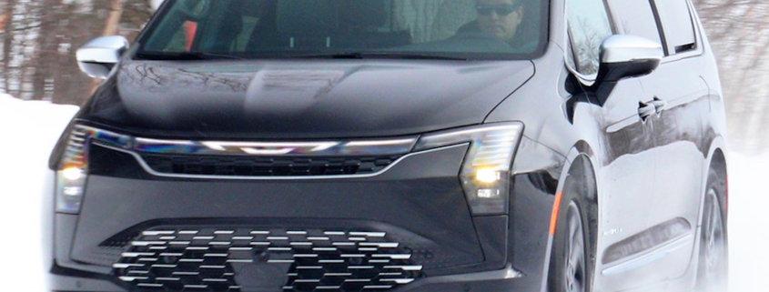 La Pacifica abandonne ses phares aux formes arrondies et sa calandre ovale au profit d’une signature plus affirmée. On découvre désormais des blocs optiques en forme de boomerang, une signature lumineuse en cascade qui descend vers le centre du pare-chocs et une présence visuelle plus large et plus anguleuse L’ensemble rappelle, dans son exécution, le langage stylistique adopté récemment par Cadillac pour ses modèles électriques, avec un effet visuel plus technologique et plus statutaire.