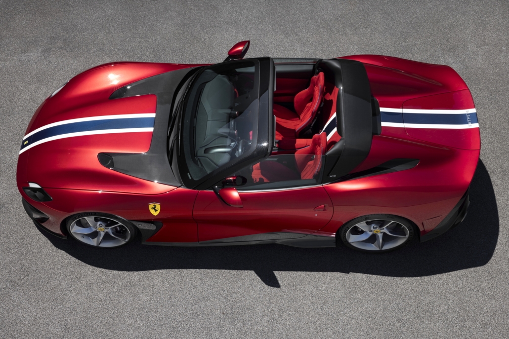 Pour sa carrosserie, Ferrari a créé une peinture trois couches unique appelée Rosso passionale (rouge passionné). Plus extravagante que celle d’une 812 GTS, sa carrosserie se distingue par des phares au design unique, ses roues exclusives, des feux arrière incorporés au déflecteur et de nombreuses garnitures de fibre de carbone dont, entre autres, cette aile transversale qui dissimule habilement l’arceau de sécurité.