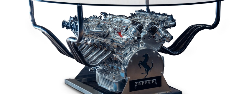 Le premier propriétaire de la table avait commandé cette unique pièce de décoration avec un moteur V12 Colombo. Un moteur que l’on retrouvait dans la Ferrari 365 GTC/4. Les Italiens sont connus pour développer et construire des moteurs V12 non seulement particulièrement puissants, mais aussi très élégants. Le moteur Colombo a fait parti de voitures à tirage très limité. Il possède des carburateurs à tirage latéral qui passent par le milieu de la culasse, directement vers la soupape d’admission. C’est une configuration de moteur unique qui donne un style à nulle autre pareil avec ses 12 échappements visibles.