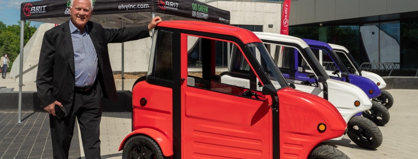 Parmi les nombreuses trouvailles que réservait le récent Salon du véhicule électrique de Montréal (SVÉM) à ses visiteurs, au Stade olympique, un curieux petit véhicule électrique au nom exotique a suscité beaucoup d’interrogations et d’étonnements. Il s’appelle Sarit et ce est si petit, qu’on peut en garer quatre côte à côte dans l’espace qu’occuperait une auto ordinaire !