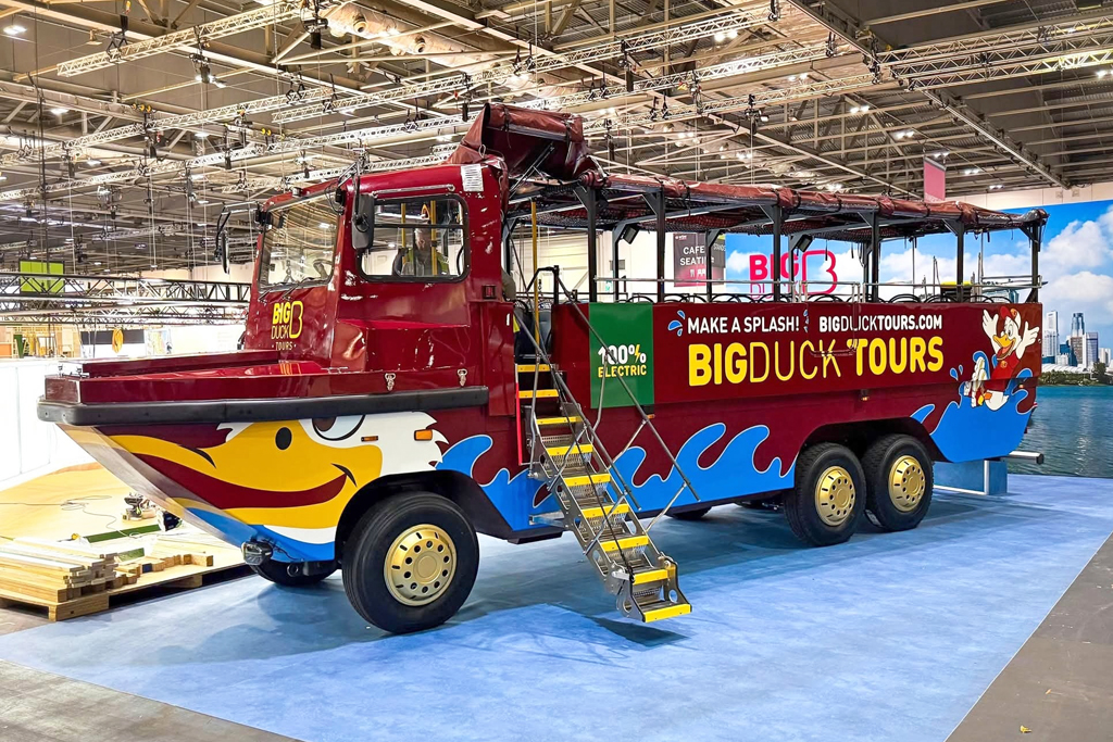 Conçu pour se déplacer sur terre et sur l’eau, ce véhicule peut accueillir 36 passagers et deux membres d’équipage. Conforme aux normes de sécurité maritime britanniques, sa batterie lui procure l’autonomie nécessaire pour une journée entière de service.