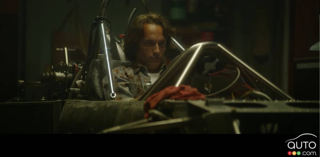 Dans ce court extrait, on peut notamment voir le personnage de Gilles Villeneuve bricoler dans un hangar, au guidon d’une motoneige de course et au volant d’une monoplace.